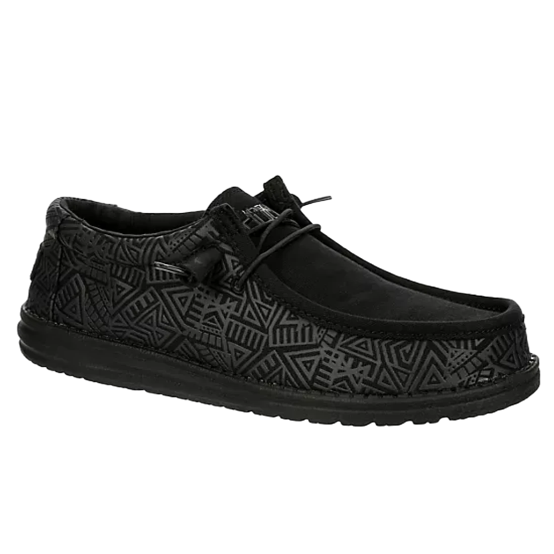 - All black Aztec pattern slip on shoes.