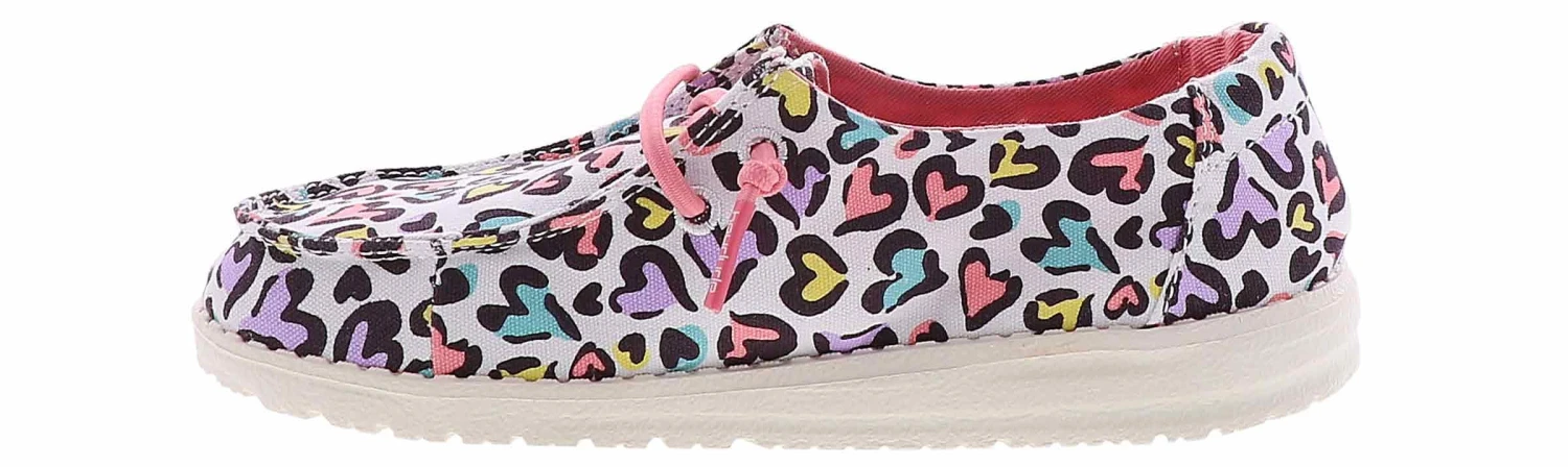 She will LOVE the Hey Dude Wendy Youth Girls’ Casual Shoe! This classic Hey Dude style has a colorful leopard print upper with adorable hearts as the spots. The insole is cushioned and the EVA outsole is lightweight! The elastic and adjustable laces make it easy for her to slip on by herself!