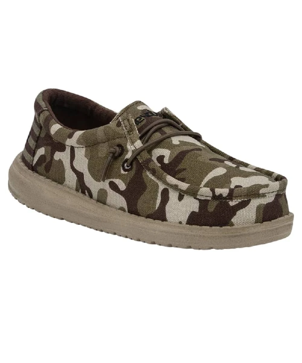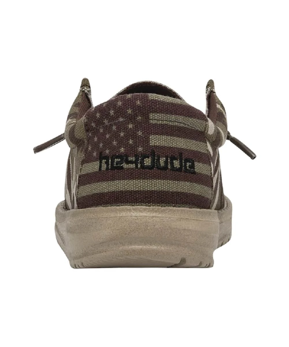 Canvas Upper; Cushioned Insole; EVA Outsole; Padded Collar Around Ankle; Slip On; Adjustable Brown Elastic Laces; Camo Flag And Brown Shoes; Style #130137037